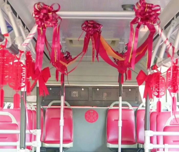 走进车厢,车窗玻璃、扶手杆、座椅等位置都被红“囍”字、“平安喜乐”挂件、祝福语举牌等精心装点,让整辆公交车充满了甜蜜温馨的氛围,十指相扣的新郎新娘脸上充满了幸福的笑容。