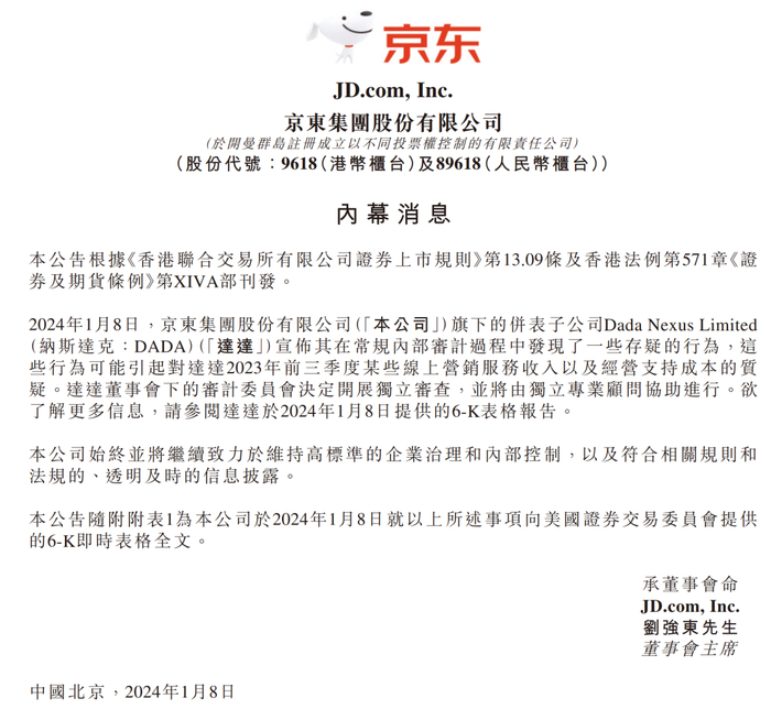 具体来看,达达集团1月8日宣布,在其例行内部审计中发现了一些可疑的做法,可能会导致公司2023年在线广告和营销服务的一些收入存疑。