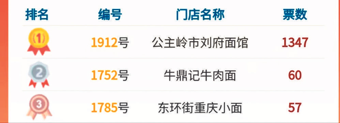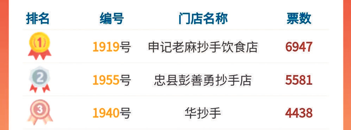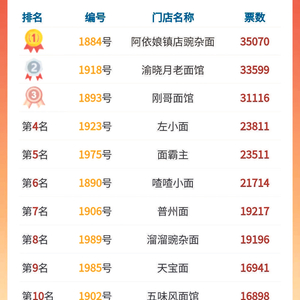 在当日的榜首名单中,我们看到了一个老朋友——阿依娘镇店豌杂面。在前日被渝晓月老面馆挤下榜首后,仅隔一天,阿依娘镇店豌杂面又以35070的超高得票数傲然回归,重新霸占综合50强榜单第一名,成为投票通道开通以来,唯一一个两次占据综合榜榜首的参赛面馆。