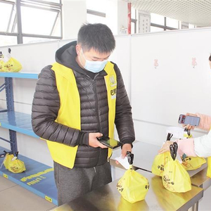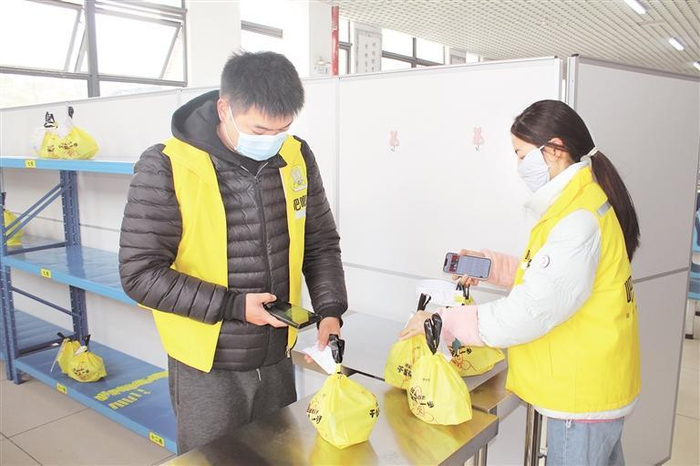 从固定窗口向内望去,贴有学生寝室楼栋号数的货架上,放着不少用黄色包装袋打好包的外卖餐食。扫码员龙晓东对准外卖订单扫码并上传数据,随后将外卖餐食归置到指定货架,再从窗口及时转移到吧唧兔外卖骑手手中。