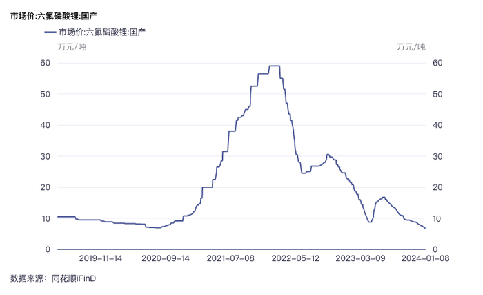 此前受益于新能源汽车领域的迅猛发展,锂盐六氟磷酸锂市场行情火爆。自2021年一路大涨之后,六氟磷酸锂价格一度涨到近60万/吨,进入2022年依旧维持高位,然而2023年六氟磷酸锂价格跳水。