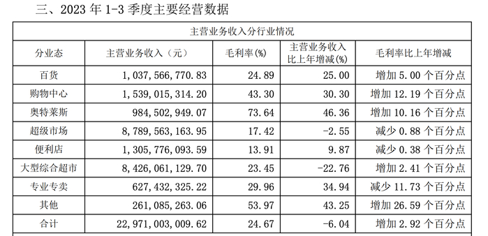 具体来看,据百联股份三季报显示,前三季度公司实现营收235.59亿元,同比下滑6.16%;归母净利润为3.44亿元,同比扭亏。其中百货、购物中心、奥特莱斯的收入共计超35亿元,占总收入约15%,营收同比增长25%、30.3%、46.36%;毛利率分别为24.89%、43.3%以及73.64%,购物中心和奥特莱斯毛利率均同比两位数增长。