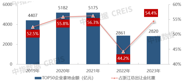 图:2019-2023年浙江省拿地金额TOP50企业及份额占比