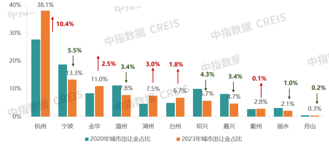 图:2023年与2020相比浙江省各城市出让金占比变化