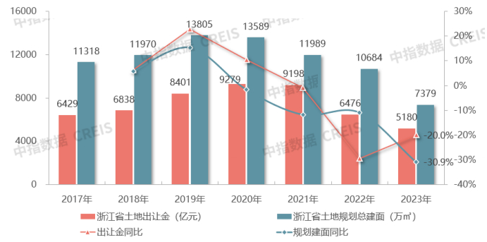 图:2017年-2023年浙江省经营性用地出让金&规划总建面