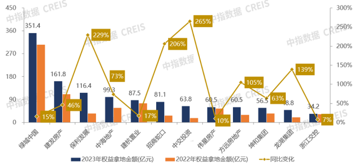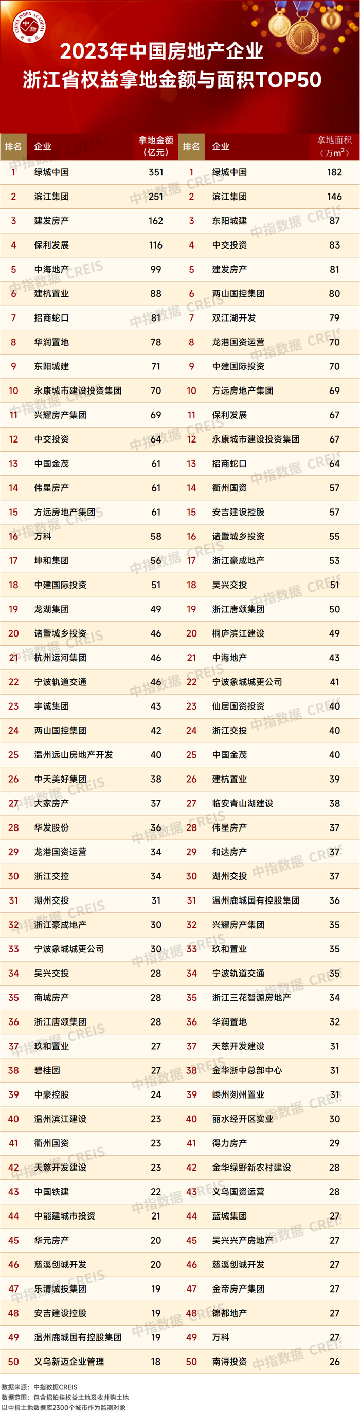 2023年的浙江土地市场虽然成交金额大幅下滑,但仍有14家主流企业加码浙江。尤其是建发房产和保利发展在浙江市场拿起权益金额超百亿。
