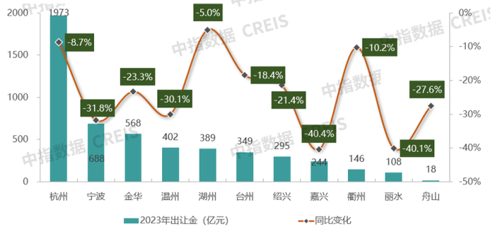 所有城市出让金均同比下滑,甬温嘉丽降幅超3成。2023年浙江省经营用地出让金以杭州的1973亿元居首,同比小幅下降8.7%;湖州市场由于整体基数不高,同比降幅也在10%以内。除此之外,其他城市同比降幅均超过2位数,尤其是宁波、温州、嘉兴和丽水4个城市的出让金骤降30%以上。