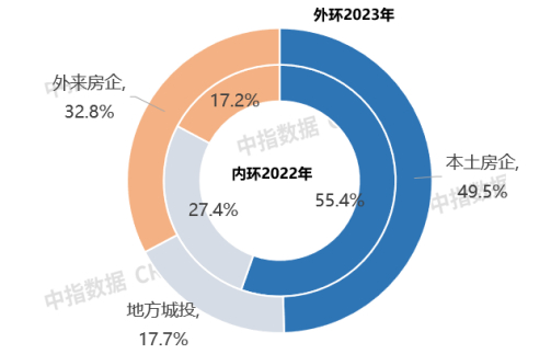 TOP50榜单大调整,外来房企金额占比提高15.6个百分点。2023年,拿地金额TOP50企业整体“大面积更迭”,相比2022年约有32家企业新上榜。相对2022年本土房企和地方城投占据绝大部分榜单的情况来看,2023年外来房企在浙江市场的布局更为积极。