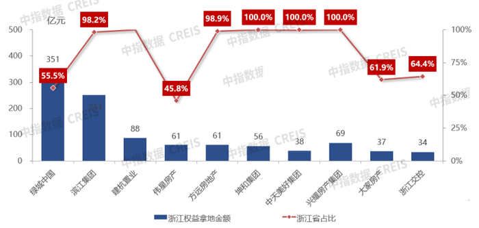 图:2023年典型本土房企浙江省权益拿地金额及占比