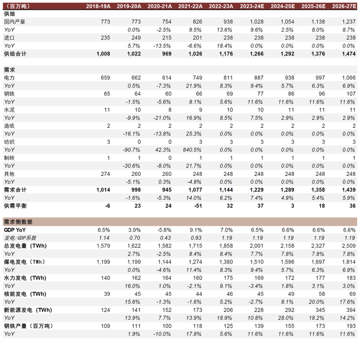 印度煤炭需求展望:1)基于GDP增速和电力需求弹性系数假设,我们预计2023-27财年(2023年4月至2027年3月)印度发电量将保持7-8%左右的增速,对应印度电煤需求增速将分别为9.4%、5.7%、6.3%、6.9%。2)根据印度政府计划,到2030年该国粗钢产能将增加至3亿吨(对应2022-30财年10%以上的CAGR),我们认为理想情况下印度钢铁用煤需求有望保持快速增长。