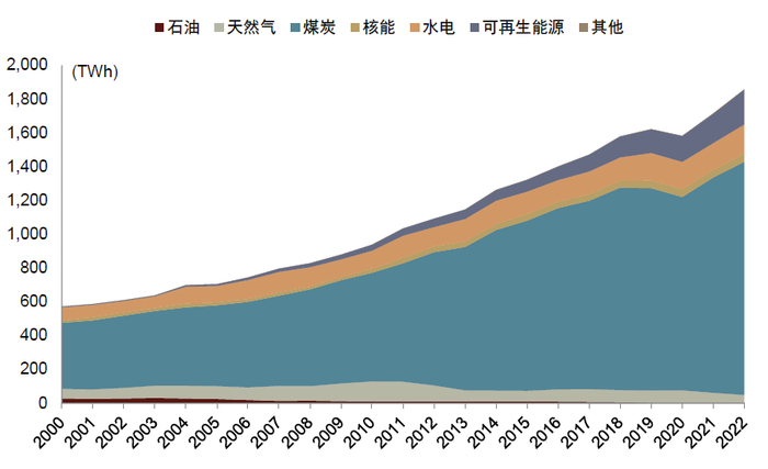 印度发电量主要来自煤电,煤电发电量由2000年的390太瓦时增加至2022年的1,380太瓦时,期间对应的CAGR为5.9%,煤电占总发电的比重由2000年的68%进一步提升到了2022年的74%。