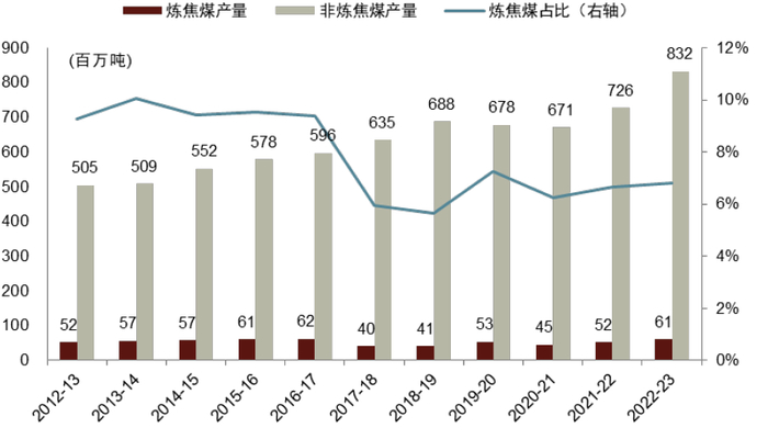 不过产量增长主要来自动力煤,炼焦煤增长平稳。根据印度煤炭部,动力煤(印度按炼焦煤和非炼焦煤口径统计,我们将非炼焦煤划分为广义动力煤)由2012-13财年的5.04亿吨增长至2022-23财年的8.32亿吨,期间对应的CAGR为5.1%。而同时期炼焦煤仅由5,160万吨增长至6,080万吨,期间对应的CAGR为1.7%,增速相对平缓。