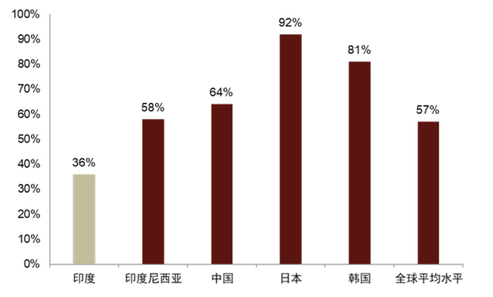 图表17:和全球部分国家和地区相比,印度城镇化率相对偏低