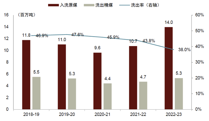 本土炼焦煤质量偏低,精煤洗出量难满足国内需求。虽然2022-23财年印度本土炼焦煤产量达6,080万吨,但大部分没有入洗,入洗原煤仅1,400万吨,洗出精煤531万吨,洗出量仅占国内炼焦煤消费量的8.1%。究其原因不是洗选产能不足,而是印度本土炼焦煤灰分含量相对较高,入洗难度高,且部分洗出精煤并不能满足钢厂对原料的要求[1],因此印度本土炼焦煤产出效率低,有效产出不足。