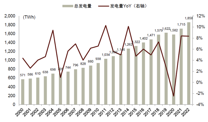 印度发电量增长较快。印度发电量由2000年的571太瓦时增加至2022年的1,858太瓦时,期间对应的CAGR达5.5%。从发电增速与GDP增速的弹性系数来看,2022年印度发电量增速与GDP增速的比值为1.19。过去20年(2002至2022年),印度发电量增速与GDP增速的平均比值约为0.9。