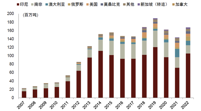 动力煤最主要进口来源地是印尼。在印度的动力煤进口中,印尼、南非、澳大利亚是最主要的进口来源国,2022年印度进口这些国家的动力煤分别为1.06亿吨、1,953万吨、1,092万吨,占动力煤总进口量的比重为63%、12%、7%。由于地缘冲突影响和俄罗斯煤炭折价带来的性价比,2022年印度进口俄罗斯动力煤的体量也有所增加,由此前400万吨以下的水平(2021年为379万吨)增加至2022年的1,009万吨,占比提升至6%。