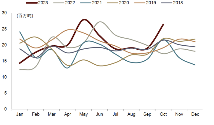 2022年印度煤炭进口量反弹增加,2023年以来增长相对平稳。2022年,在全球以及印度当地能源供需紧张的背景下,印度进口煤炭需求有所提升,进口量同比增长11%至2.34亿吨(根据IHS McCloskey数据,其中,广义动力煤同比增加16.5%至1.68亿吨,炼焦煤同比减少2.0%至6,647万吨),总量上结束2020、2021年两年的下滑。2023年1-10月,印度煤炭进口量同比+4.5%至2.06亿吨。