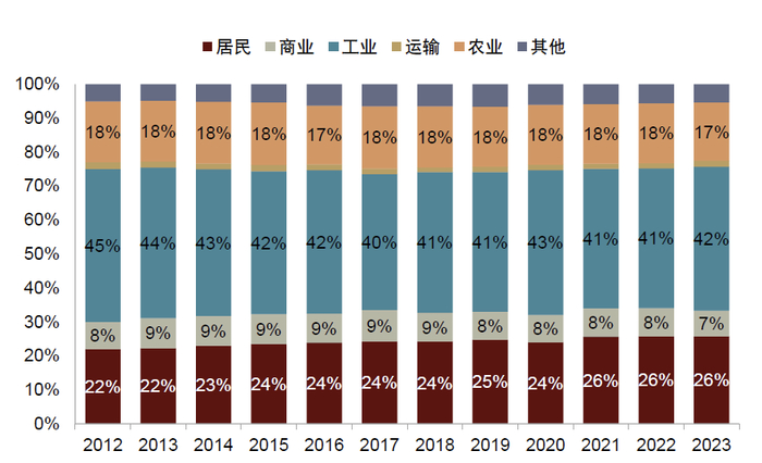 电力消费以工业生产与居民生活为主,工业用电占比存在上升空间。2022-23财年印度全国电力消费量达到140.3万GWh,其中工业用电占比为42.4%,居民生活用电占比25.8%。工业用电所占比重低于亚太地区53%的平均水平,对比中国、韩国等地区仍存在差距。我们认为随着印度进一步发展工业,尤其是推进钢铁等高耗能行业的发展,该国工业用电占比有望进一步提升。
