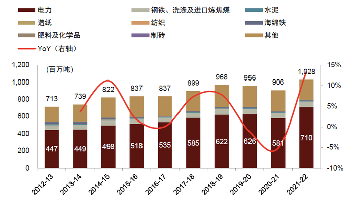 图表12:印度电力用煤消费量(含煤炭及褐煤)