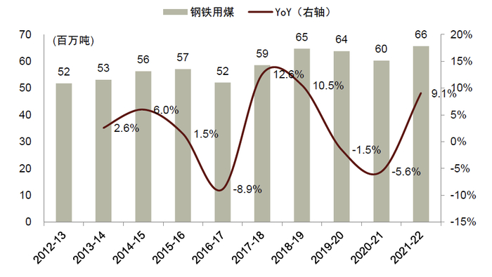 印度是全球第二大钢铁生产国。2022年印度粗钢产量同比增长5.6%至1.25亿吨,2012年至2022年10年对应的CAGR为4.9%。根据印度煤炭部,2021-22财年印度钢铁用煤(含煤炭及褐煤)为6,565万吨,同比增长9.1%。