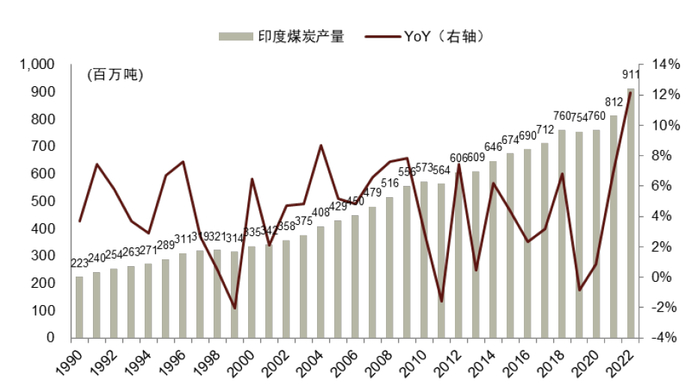 注:1)产量指原煤产量;2)印度财年(4月1日至次年3月31日)