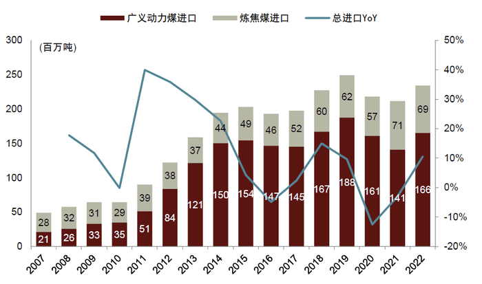 印度是煤炭进口大国。随着印度国内能源需求的持续增长,在供需存在一定地域错配的情况下,印度煤炭进口量逐渐增加,总进口量由2007年的4,900万吨左右提升至2022年的2.34亿吨,期间对应的CAGR达到11%。从市场占比角度看,根据IEA数据,2022年印度煤炭进口量占全球总进口的比重为16%(其中,广义动力煤进口量占全球的15.2%,炼焦煤进口量占全球的20.7%),在全球煤炭贸易市场中具备一定影响力。