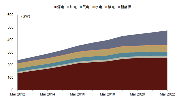 从电力装机角度来看,印度煤电装机占比高,且是主要装机增量来源。根据印度中央电力局,印度电力装机规模由2012年3月末的239.3GW增加至2022年3月末的476GW(包括电厂装机和非电企业装机,2022年电厂、非电企业装机分别为399.5GW、76.7GW),其中煤电装机规模截至2022年3月末约为256GW,占总装机规模的54%。煤电装机10年间累计增加121GW,新能源累计增加91GW,分别占装机增量的51%、39%。