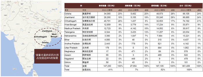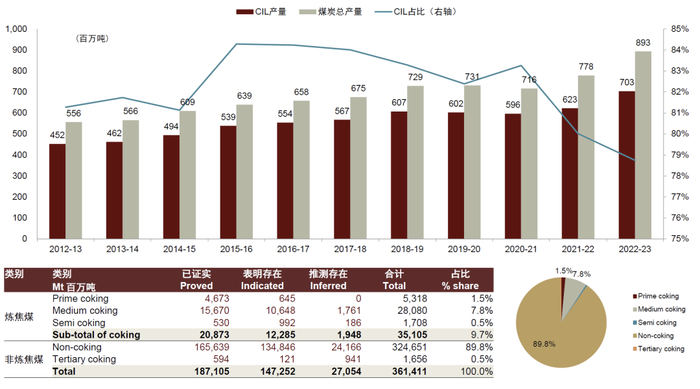 注:1)2022-23指印度财年(4月1日至次年3月31日);2)非炼焦煤可理解为广义动力煤;3)总储量与上图口径存在一定误差
