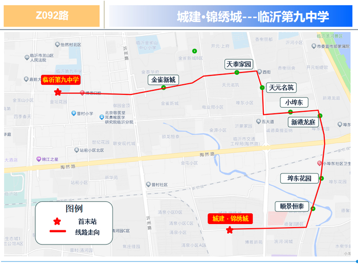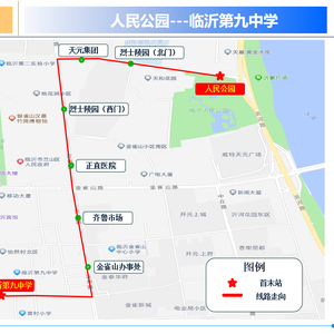 由城建·锦绣城至临沂第九中学,线路途经五号线、祝丘路、金源路、中丘路、金坛路,全程约3.6公里,覆盖沿途城建·锦绣城、德馨园B区、颐景恒泰、埠东花园、埠东家园、埠东小区、香榭丽墅、天泰家园、天元名筑、金雀新城、金泰华府共11个社区。设8处停靠点:城建·锦绣城、颐景恒泰、埠东花园、新港龙庭、小埠东、天元名筑、天泰家园、金雀新城。