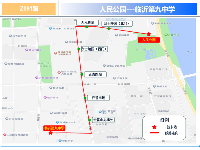 由人民公园至临沂第九中学,线路途经银雀山路、沂州路、金坛路,全程约3.5公里,覆盖天基·黄金水岸、东苑小区、市肿瘤医院家属院、天河花园、天元家属院、慧谷倾城、桃花涧小区、小市委家属院、南坦小区、金泰华府共10个社区。设7处停靠点:人民公园、烈士陵园(北门)、天元集团、烈士陵园(西门)、正直医院、齐鲁市场、金雀山办事处。