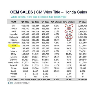 该榜单上其他显著的变化是,本田汽车在美国的销量同比增长了33%,超出特斯拉的25%。在销量的同比变化幅度方面,还有其他车企超越了特斯拉,包括吉利-沃尔沃、里维安和Lucid,不过这几家在市场份额方面排名靠后。