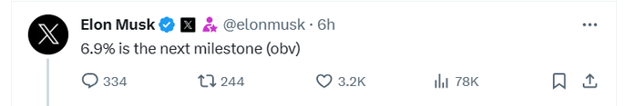 电动汽车分析师Sawyer Merritt在社交媒体X上分享了这一最新数据,马斯克半开玩笑地回应,“6.9%是下一个里程碑”。