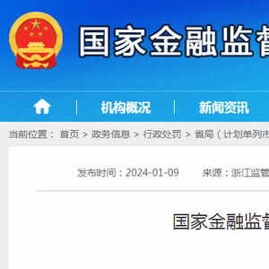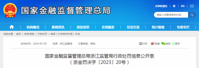 国家金融监督管理总局浙江监管局行政处罚信息公开表(浙金罚决字〔2023〕20号)