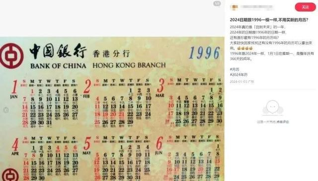 记者查询年历发现,这两年都是闰年,且元旦同为星期一。很多网友发现了这一现象,一时掀起了淘1996年旧日历的热潮。