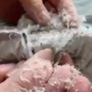 该网友发布的视频显示,羽绒服上有一张字条,载明“全身绒子人为洗坏”。羽绒服商标为“波司登”,有人拿着工具拆开后,从衣服里捏出呈絮状和粉末状的填充物。