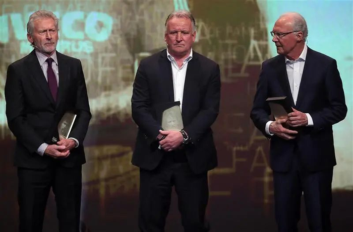 2019年4月1日,在德国多特蒙德的德国足球博物馆,德国足球名宿、名人堂成员保罗·布赖特纳、安德烈亚斯·布雷默和贝肯鲍尔(左至右)登台领取最佳防守球员奖。 当日,德国足球名人堂向公众开放。入选足球名人堂的名宿由德国体育记者评选确定。 新华社/欧新