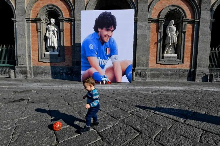 2020年11月27日,在意大利那不勒斯,一名儿童在马拉多纳的照片前踢球。 11月25日,阿根廷传奇球星迭戈·马拉多纳突发心梗在家中去世,享年60岁。 新华社/欧新