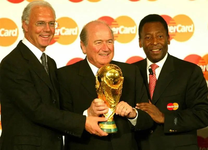 2003年3月12日,国际足联主席布拉特(中)、球王贝利(右)和足球皇帝贝肯鲍尔在德国柏林举行的万事达卡赞助国际足坛五大赛事签字仪式上,向人们展示金光闪闪的“世界杯”。万事达卡赞助的五项赛事为“2006国际足联世界杯”、“2004欧洲足球锦标赛”、“2006欧洲冠军联赛”、“2004美洲杯”和“2003南美解放者杯”。 新华社记者 李明放摄(数码传真照片)