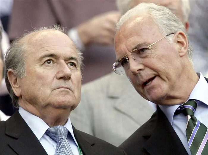 2016年3月22日,国际足联道德委员会宣布正式启动对德国申办2006年世界杯的调查,调查的对象包括贝肯鲍尔在内6个人。图为2006年6月26日,在德国科隆举行的一场世界杯十六强比赛前,时任德国世界杯组委会主席的贝肯鲍尔(右)与时任国际足联主席的布拉特交谈。 新华社/美联