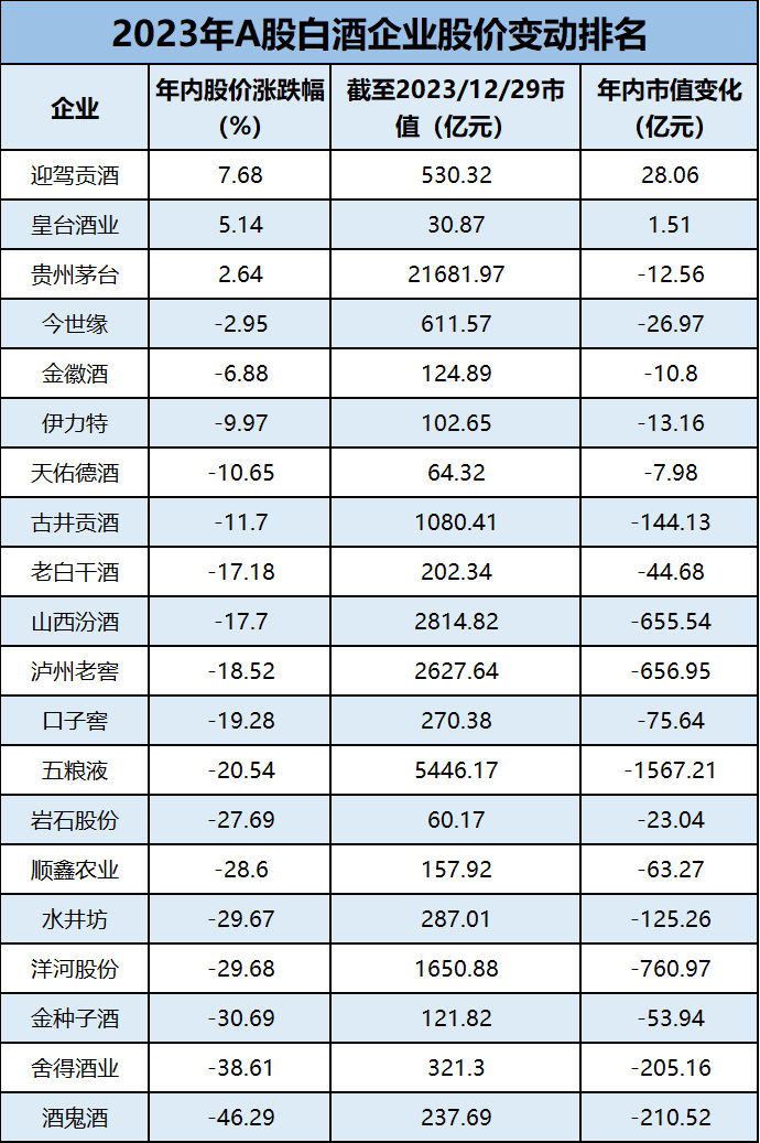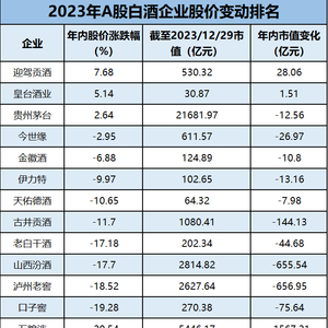 二级市场方面,自10月起,白酒板块迎来多次集体大跌,截至2023年12月29日收盘,全年有14家白酒企业跌幅超10%,其中8家跌幅超20%,酒鬼酒年内股价更是近乎腰斩。