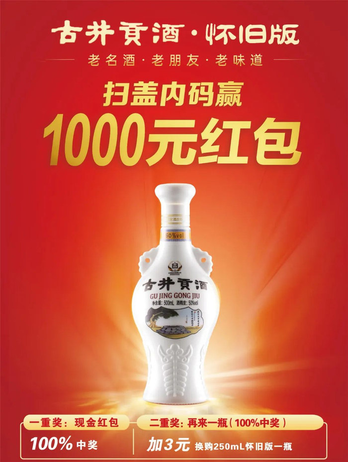 本次“扫盖内码赢1000元红包及再来一瓶”活动覆盖全国,二重奖叠加力度空前:一重奖,100%现金红包,至高可得1000元;二重奖,抽再来一瓶,加3元兑换古井贡酒怀旧版一瓶。活动覆盖范围广、综合中奖率100%,这无疑为古井贡酒怀旧版的春节开瓶动销助力颇多,直击C端,实现了渠道内的精准破圈营销。