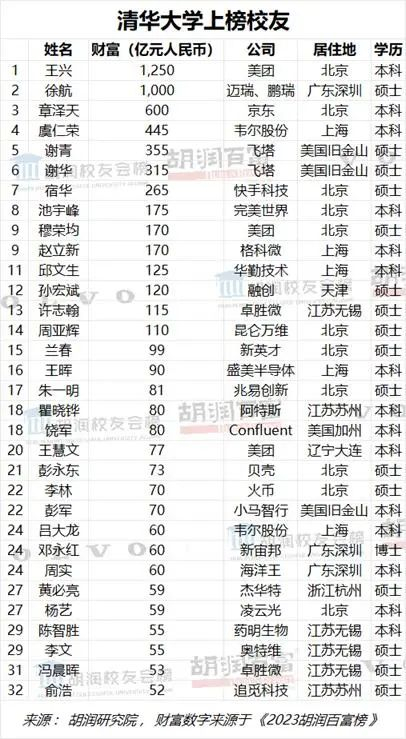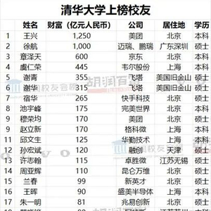 近日,胡润研究院发布《胡润校友会榜》,在校友会榜中,清华和浙大校友各32人登上50亿财富门槛的胡润百富榜,并列第一。而在清华大学上榜校友的名单中,章泽天在列,以净资产600亿的身家在清华优秀校友中排行第三。