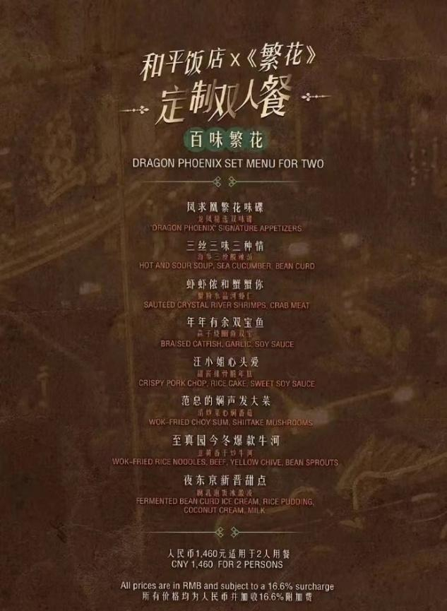 比如,和平饭店面对流量,推出了1460元的《繁花》双人餐,加收服务费后售价1702元,每日限量20份。