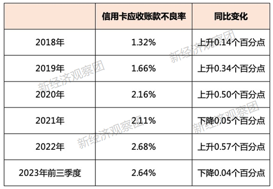 信用卡中心的问题频发,也导致应收账款不良率的激增。近五年来,平安银行信用卡应收账款不良率不断起伏增长,2018年还只有1.32%,到2022年已经飙升至2.68%,五年上升了1.36个百分点。虽然2023年前三季度有所回落,但仍有2.64%,仅下滑了0.04个百分点。