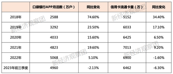 同时,口袋银行APP的月活数也在跟信用卡流通量一样,在高速增长后逐步转入下行通道。2018年-2923年前三季度,月活数分别为2588万、3292万、4033万、4823万、5068万、4960万,2018年增速一度高达74,6%,20199-2021年增速保持在双位数,2022年直转直下到个位数增长,2023年前三季度进入负增长。