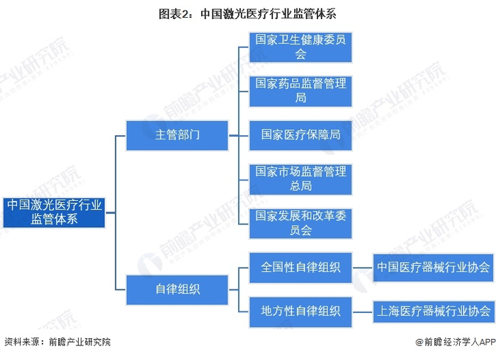 激光医疗产品与人民生命健康直接相关,因此激光医疗设备及其流通体系属于国家严格监管对象。我国激光医疗监管体系建设仍处于进一步完善中。目前,我国激光医疗行业以卫建委、医保局、药监局、市场监督管理局等政府部门监管为主,以等全国性行业协会自律监管为辅。