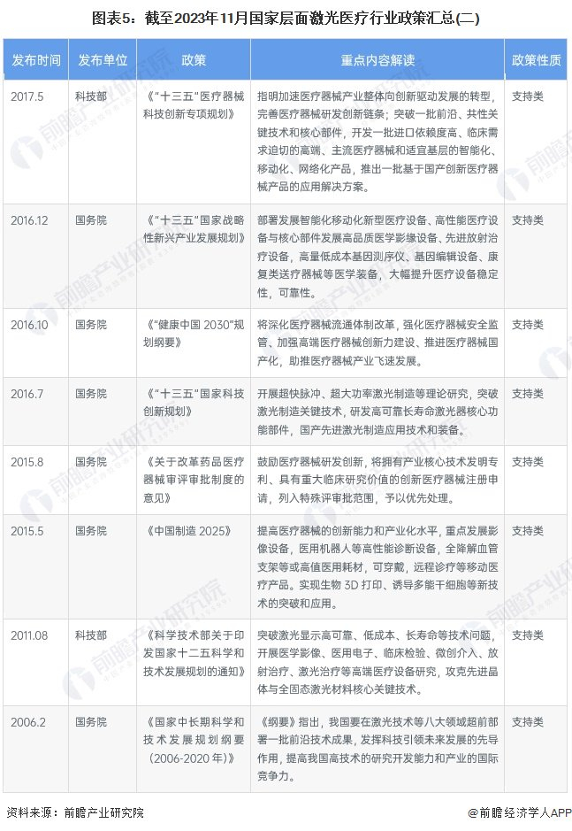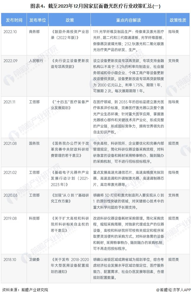 激光医疗行业为提高居民的身体健康水平起到了重要的作用,同时随着国家对于医疗器械、先进智能制造等行业的支持政策的陆续出台,行业在规范和指导中有序发展。截至2023年12月国家层面激光医疗行业政策汇总如下: