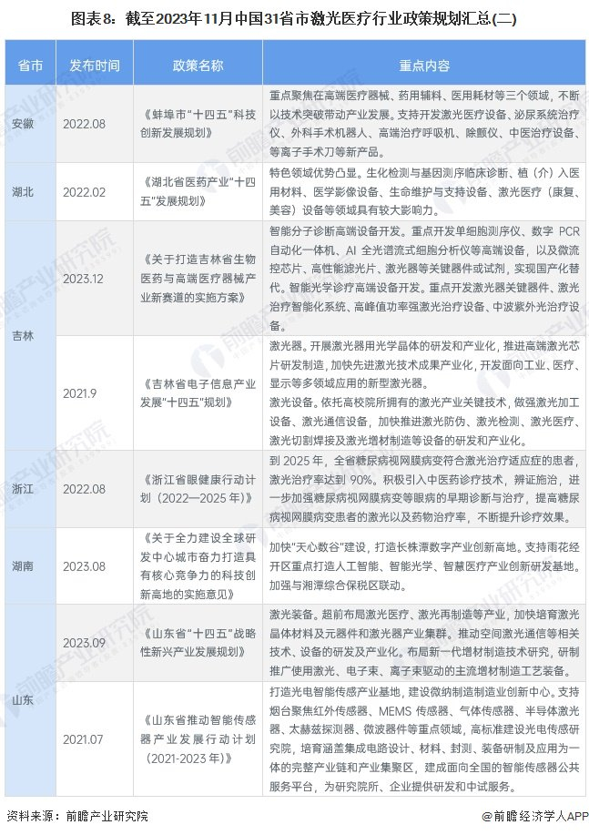从省市发展规来看,明确对激光医疗有规划的省份有河北、山东、湖北、安徽、浙江、广西以及广东。其中,安徽、湖北、广东、河北四省发布支持布局激光医疗设备,山东支持布局激光医疗产业集群,广西鼓励研究激光美容技术,北京、上海主要在激光整体产业上进行技术上的鼓励,以带动激光医疗的发展;而浙江有明确规定到2025年,糖网病激光治疗率达90%。