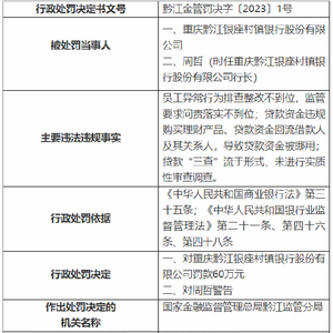 因员工异常行为排查整改不到位等 重庆黔江银座村镇银行被罚60万元