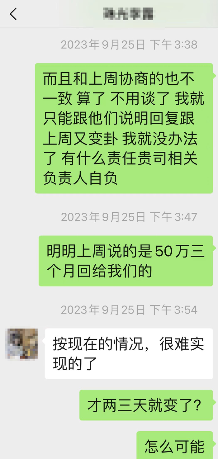 z先生称,开发商先是答应了三个月内返还50万,但资金紧张,一周后又改口说“很难实现”。